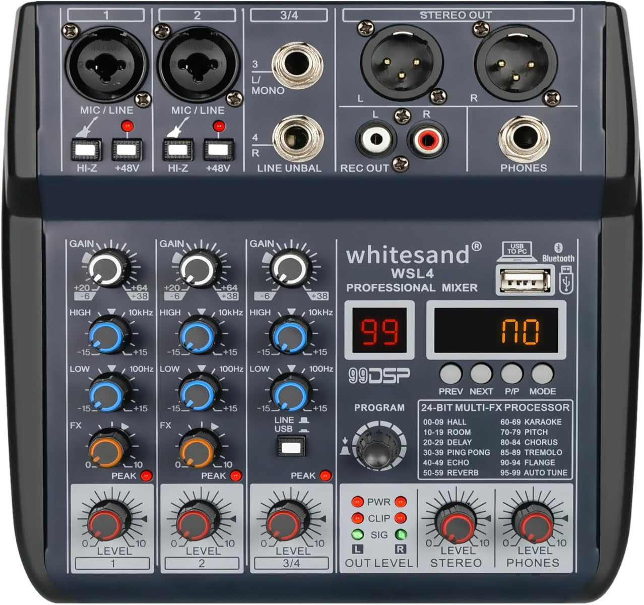 - [Multiusos] La interfaz USB se puede conectar a Bluetooth, disco U, MP3, y cada canal tiene un ajuste de graves altos y bajos para hacer que el sonido sea más perfecto. mixer