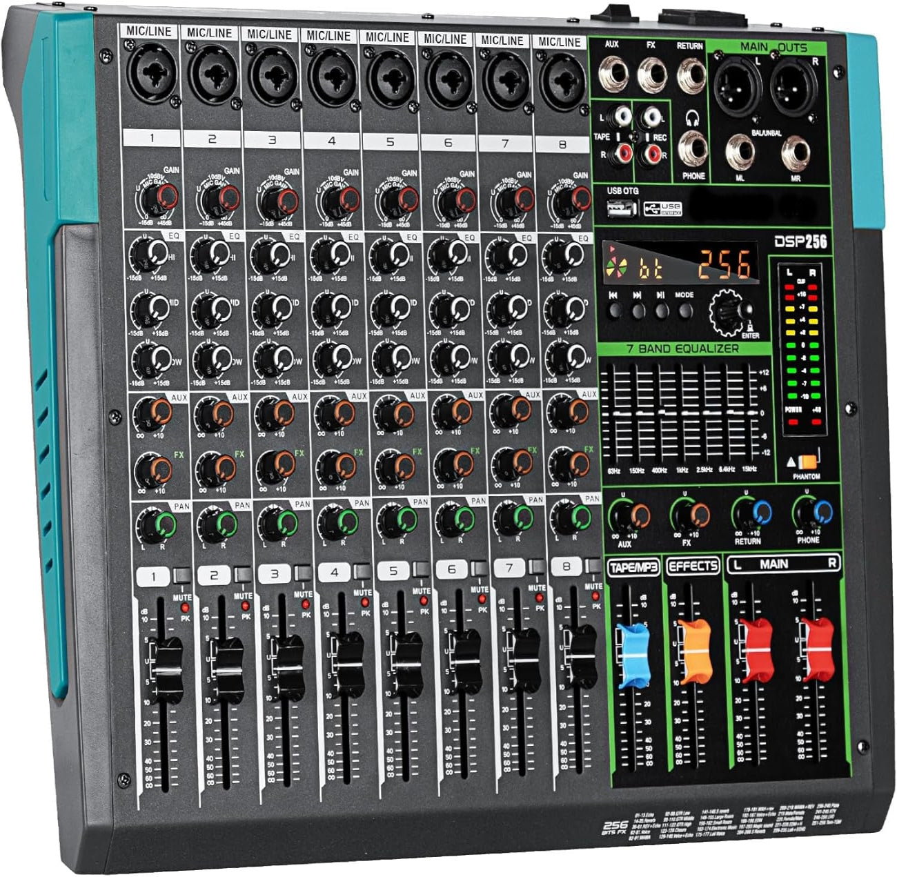 - Mezclador de 8 canales, con MUTE, función MP3 con efectos digitales USB y DSP, compresor giratorio para un fácil control, graves más fuertes y voces más limpias.