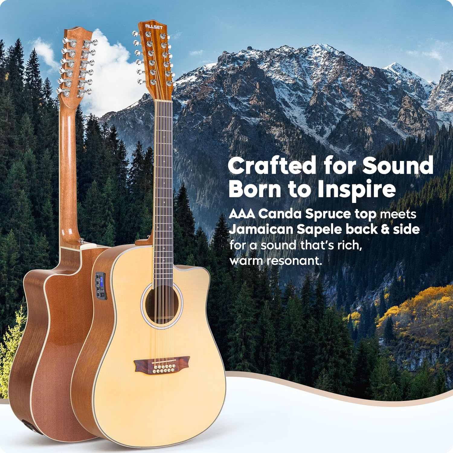 - Madera de tono prémium para un sonido de calidad de estudio: con una parte superior sólida de pícea Adirondack (procedente de bosques de los Apalaches) y parte trasera y lados de caoba hondureña, esta guitarra de 12 cuerdas ofrece una claridad inigualable, ricos armónicos y proyección dinámica. El grano apretado del Adirondack Spruce garantiza una respuesta más rápida de la caja de resonancia, por lo que es perfecto para un intrincado juego con los dedos, desde delicados arpegios hasta rasgueos audaces.